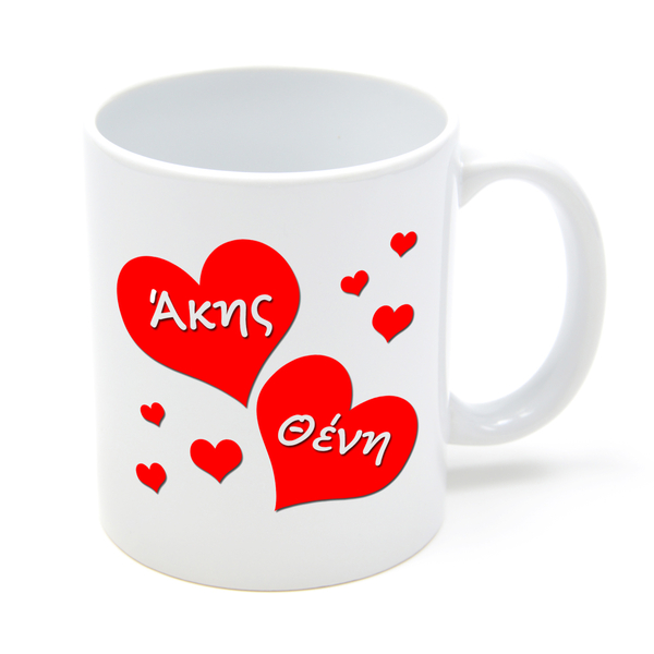 - Στην κούπα γίνεται εκτύπωση της φωτογραφίας της επιλογής σας από την μια όψη και των ονομάτων όπου εσείς επιλέγετε μέσα σε καρδούλες από την άλλη όψη.