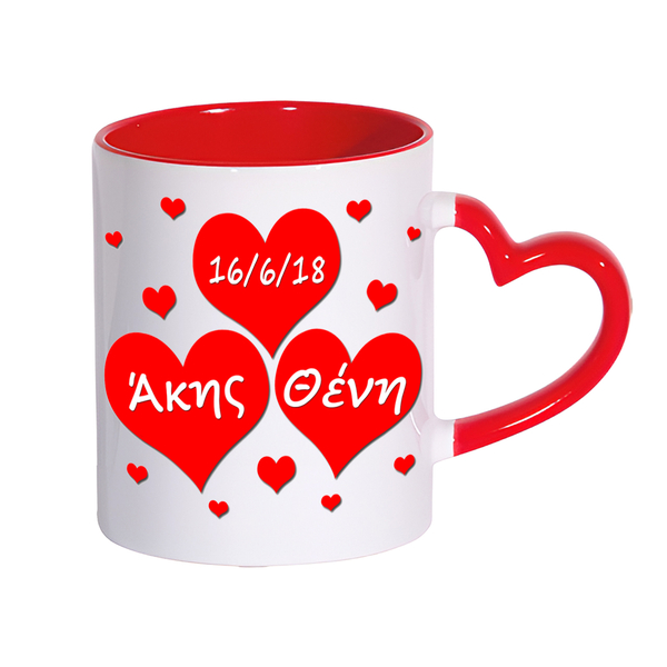 Κούπα με Χερούλι Καρδιάς Κόκκινο - Με την Φωτογραφία σας, Ημερομηνία & Ονόματα Μέσα σε Καρδούλες