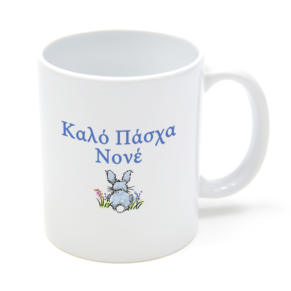 - Στην κούπα τυπώνετε την φωτογραφία σας από την μια όψη της και από την άλλη όψη της το σχέδιο Καλό Πάσχα Νονέ Κουνελάκι Μπλε που εσείς επιλέξατε.