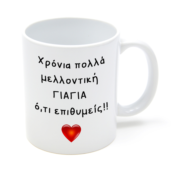 - Στην κούπα τυπώνετε την φωτογραφία σας από την μια όψη της και από την άλλη όψη της το σχέδιο Καλύτερη Νέα Γιαγιά που εσείς επιλέξατε.