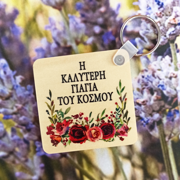Μπρελόκ με υφή ξύλου που έχει πάνω του εκτυπωμένο, ένα έτοιμο σχέδιο της επιλογής σας.