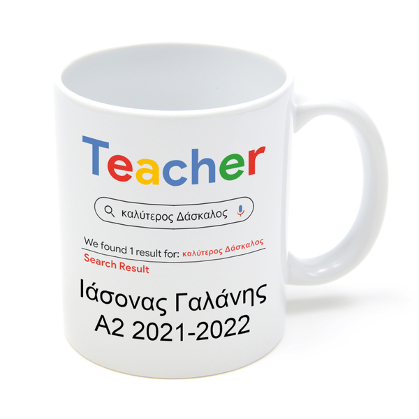 - Στην κούπα τυπώνετε την φωτογραφία σας από την μια όψη της και από την άλλη όψη της το σχέδιο Search best δάσκαλος που εσείς επιλέξατε.
