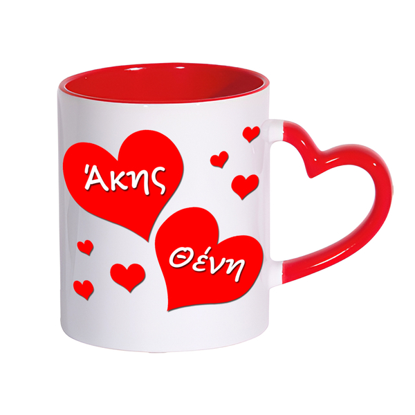 Κούπα με Χερούλι Καρδιάς Κόκκινο - Με την Φωτογραφία σας & τα Ονόματα σας Μέσα σε Καρδούλες