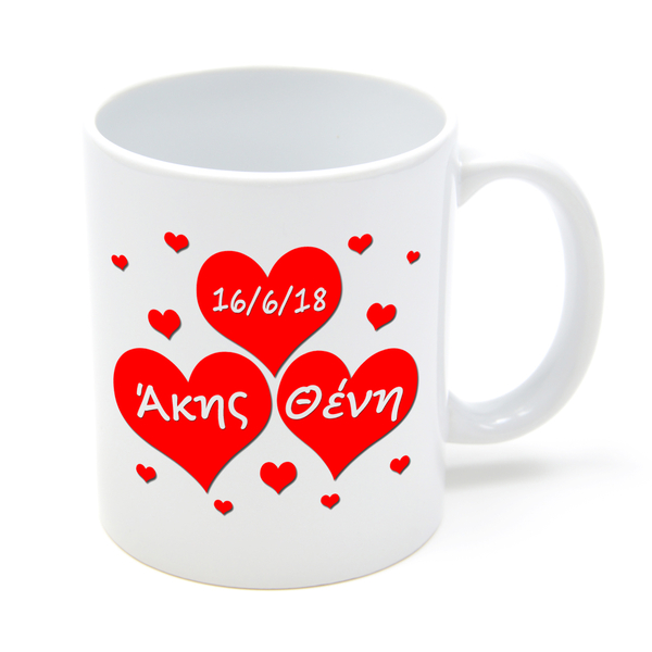 - Στην κούπα γίνεται εκτύπωση της φωτογραφίας της επιλογής σας από την μια όψη και των ονομάτων και της ημερομηνίας όπου εσείς επιλέγετε μέσα σε καρδούλες από την άλλη όψη.